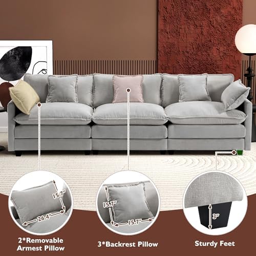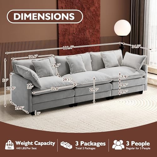 The Cloud Couch measures 111.4″W x 34.3″D x 33″H, making it a perfect centerpiece for your living room. Each sofa arrives in three boxes for easy transport, although they may arrive separately. Included in the package are all numbered parts, tools, and clear step-by-step instructions, allowing for straightforward assembly. With the provided tools, you can set up your couch in just 30 minutes. Should you encounter any issues upon receipt, please do not hesitate to reach out for assistance.